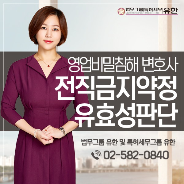 한편, 이전 회사로부터 충분한 대가를 지급받았고 보호해야 하는 영업비밀이 더 중요하다면 위약금을 지급해야 하는 경우도 있으니 이와 관련한 법률상담이 필요하신 분들은 법무그룹 유한 02-582-0840으로 문의하시기 바랍니다.