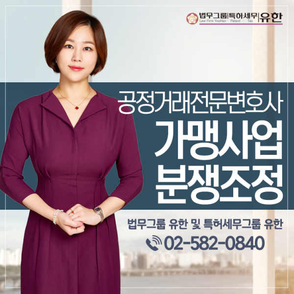 고은희 대표 변호사는 전국에 30여명이 유일한 대한변호사협회등록 공정거래전문변호사이자, 가맹거래사이며, 더페이스샵(LG생건) 가맹본부의 불공정거래행위, 못된고양이(엔캣) 가맹본부의 허위·과장정보제공 사건, 꽃마름 샤브샤브 가맹본부의 허위·과장정보제공 사건 등 대형 사건을 맡아 억대 과징금처분 및 억대 손해배상금을 이끌어내는 등 사회적으로 이슈가 되고 주목할만한 성공사례 끊임없이 축적하고 있습니다. 이와 관련한 도움이 필요하신 분들은 법무그룹 유한으로 문의하시기 바랍니다.