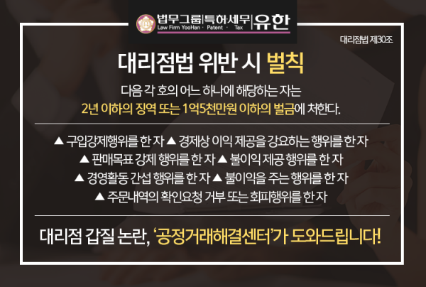 2016년부터 시행된 「대리점법」에 따라 대리점거래에서 비일비재했던 ▲구입강제행위 ▲판매목표강제행위 ▲불이익제공행위 등에 대한 적극적인 법적제재가 이루어지게 되었습니다.