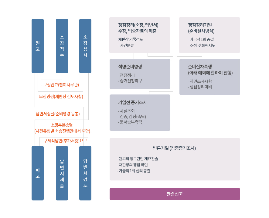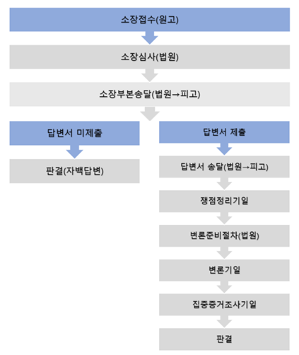 민사소송은 ‘원고의 소장 접수 - 법원의 소장 심사 - 법원의 피고에의 통지 - 변론준비기일과 변론기일 - 변론 종결 및 판결’의 절차로 이뤄집니다.